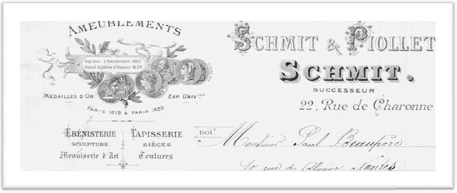 Emile devient ensuite associé dans la Société Schmit (successeur de Schmit & Piollet), ameublement, ébénisterie et tapisserie, 22 rue de Charonne. Cette société avait des clients prestigieux comme la Résidence du Prince Masséna à Nice ou sa Résidence en Indochine.Emile épouse le 25 mars 1886 à Paris, Lucie Marie Louise Gilbert, fille de Victor Gilbert, carossier, et de Louise Alphonsine Thian. Une soeur de Lucie épouse Adrien Mithouard, homme de lettres et futur Président du Conseil Municipal de Paris (Une place porte son nom dans le 7ème arrondissement). Les Beaupère et les Mithouard étaient très proches. (Adrien Mithouard possédait le château de Bazouges en Sarthe).