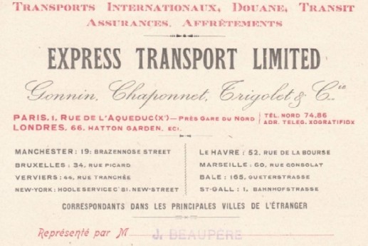 En janvier 1921, courrier à Paul, il y parle du "marasme dans lequel se débat le commerce", il joint une carte professionnelle de la société qu'il représente : "Express Transport Limited", transports internationaux, agence en douane, 1, rue de l'Aqueduc Paris 1er, agences à Manchester, Bruxelles, Verviers, le Havre, Marseille, Bâle,et St Gall.