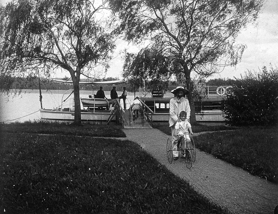 Le Saint Georges devant La Gamoterie. Marthe Beaupère en vélo poussée par son père Paul Henri,