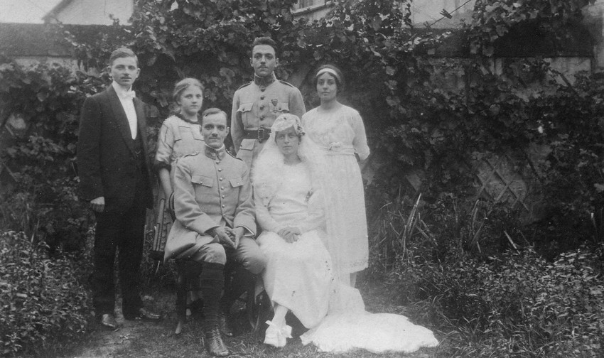 Sur cette photo, derrière les deux mariés, de gauche à droite, Jean et Madeleine Haudebourg, les cousins germains de Paul, Michel Haudebourg, son frère, Andrée Charbonnier, la soeur de Suzanne.