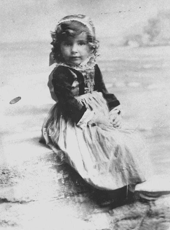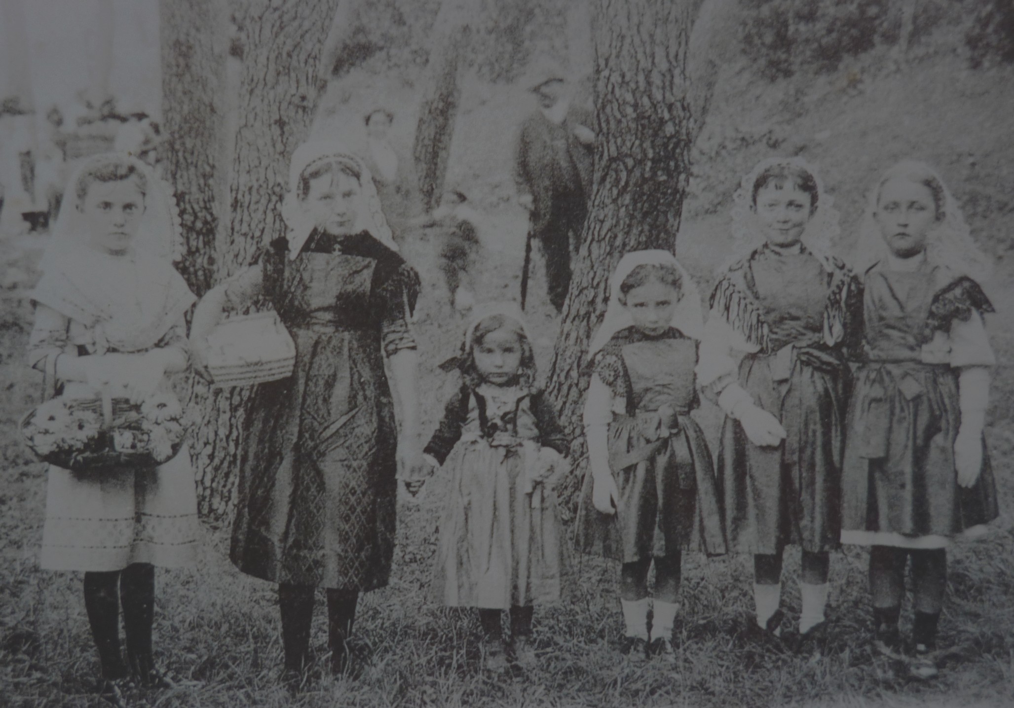 Lors d'une fête au Bourg de Batz, un groupe d'enfants déguisés en paludiers pose pour une photographie, . Au milieu d'eux, la plus petite fille est Lise, la dernière fille d'Hélène et Benjamin Maury .